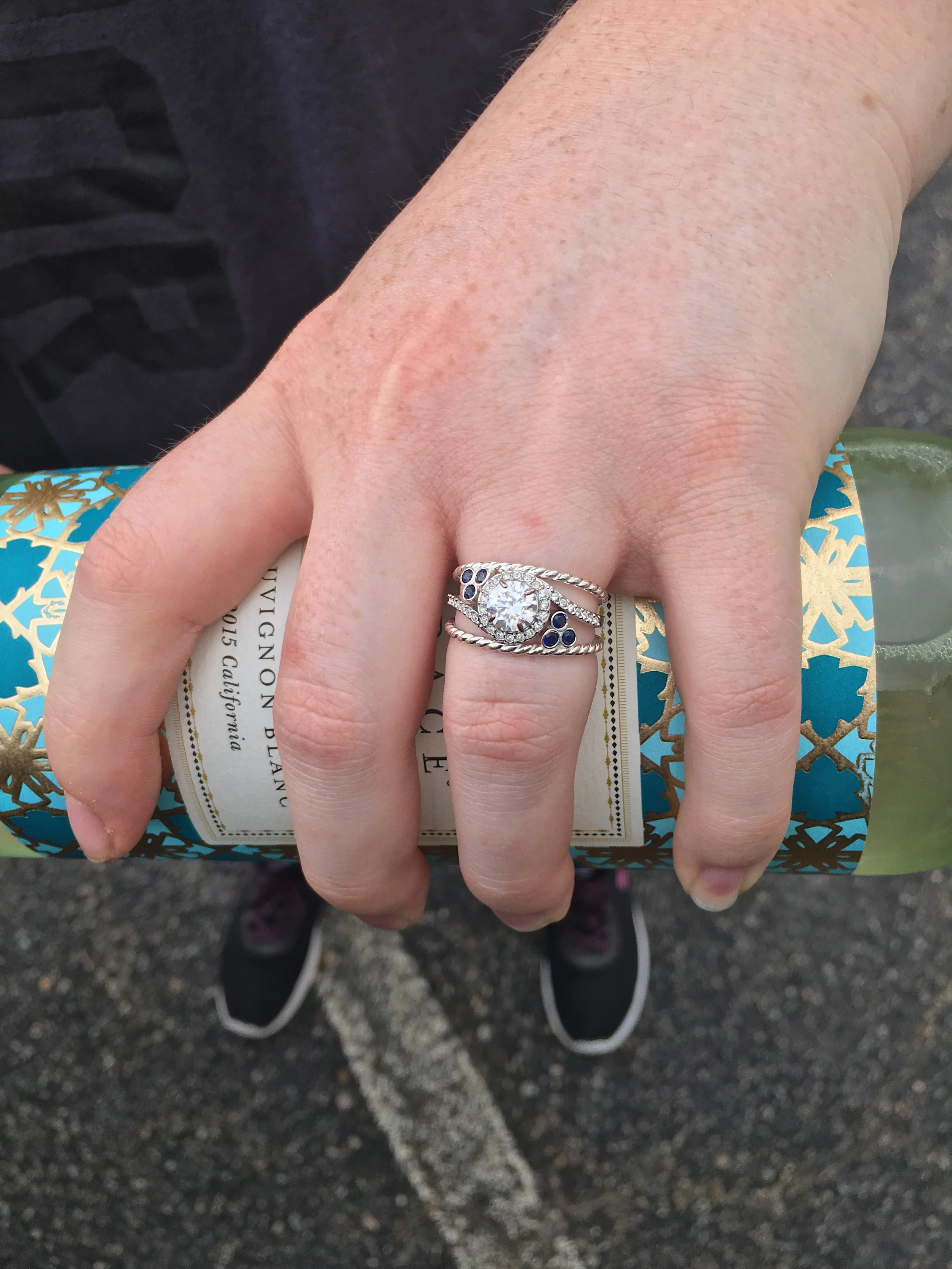 Sometimes I just make the bands. This client had a beautiful engagement ring that didn't offer a wedding band to match. We came up with a plan to make double wedding bands so the rings would look balanced. Her mom had a ring she was no longer wearing and wanted to pass it on to the bride-to-be. I removed the sapphires from the heirloom ring and used six of them in these two bands. The bride chose a nautical rope style shank for her rings because her groom is in the NAVY.